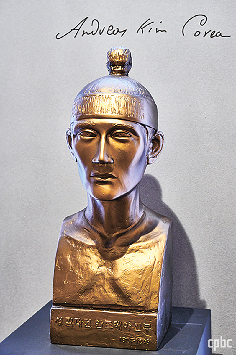 - 김대건 신부 기념관에 있는 김대건 성상. 성인의 두개골을 실측해 조각했다.