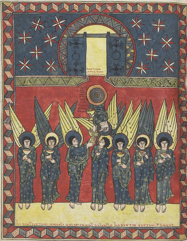 - 1060년경 프랑스 가스코뉴 수도원에서 제작된 유일한 프랑스어 ‘베아투스(Beatus)’ 「생 세베흐 베아투스」의 삽화 중 <일곱 재앙>. 출처 위키미디어