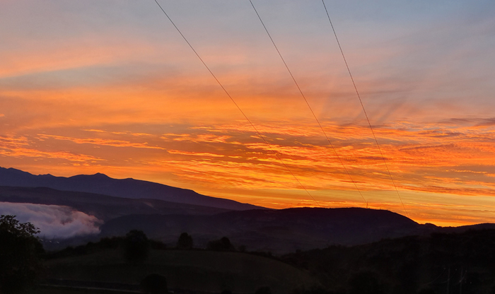 예정에 없던 라바날의 연박으로 인해 마라톤 풀코스를 걸어야 했다. 새벽 6시에 총총히 박힌 별하늘을 머리에 이고 휴대폰 손전등을 켜고 내리막을 걸었다. 뭔가 나타날 것 같은 불안감에 한 시간 정도를 거의 뛰다 싶게 내려온 내리막길은 다행히 도로로 이어졌다. 그러나 길은 오르막과 내리막이 반복되면서 몸과 마음의 인내를 시험했다. 표지석을 보니 꽤 걸어 내려왔으나 아직도 1230m 고지에 있었다. 동터오는 하늘이 붉게 물들어 장관을 이룬다. 잠시 그 모습을 카메라에 담았다.