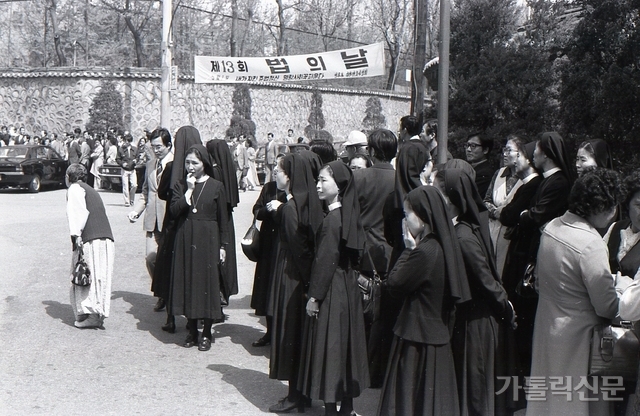 - 1976년 명동 3·1 구국선언 사건으로 구속된 인사들에 대한 1차 공판이 열린 5월 7일 서울구치소(서대문형무소) 앞에 많은 인파가 몰려 있는 모습. 가톨릭신문 자료사진.유신 체제와 교회의 각성