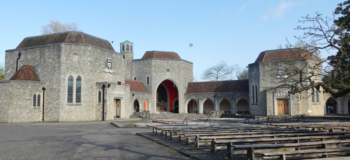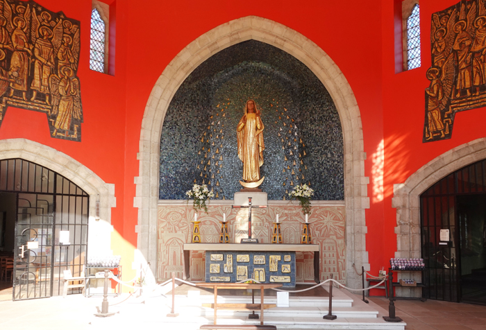 - 에일즈포드 수도원의 전경, 성모 경당(중앙의 검은 아치 부분)과 성 요셉 경당(좌측), 합창단 경당(우측)