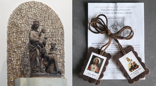- 시몬 스톡에게 스카풀라를 주시는 성모님(카르멜산회 수도사를 위한 경당 제단 벽) (좌), 일반 신자들이 착용하는 ‘신심용 스카폴라’(우)